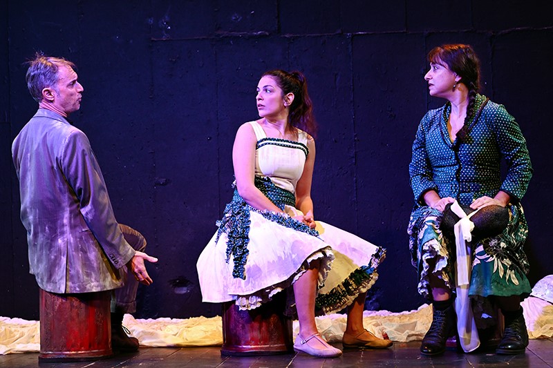 Ο συγκεκριμένος ρόλος έχει την εξής ιδιαιτερότητα: είναι χωρισμένος στη μέση. Η ηρωίδα σε δύο φάσεις της ζωής της: την παιδική και την ενήλικη. Είναι ενδιαφέρον και συνάμα παράξενο για τον ηθοποιό να βλέπει «τη ζωή του» (του ρόλου εννοώ) να ξετυλίγεται μπροστά του και να ξαναζεί τα γεγονότα που τον σημάδεψαν μέσα από το σώμα, την ψυχή και την έκφραση κάποιου άλλου. Εγώ παίζω μια γυναίκα μεγάλη και η Μαρία Θρασυβουλίδη παίζει τον ίδιο ρόλο σε μικρή ηλικία. Σαν τα κομμάτια ενός παζλ που βρίσκουν τη θέση τους το ένα πλάι στο άλλο με τον πιο αθόρυβο και ήπιο τρόπο. Επίσης και οι τρεις ηθοποιοί εκτός από τους ρόλους που ερμηνεύουμε είμαστε και αφηγητές. Συνεχίζουμε την ιστορία και κάθε τόσο διαστέλλουμε τον χρόνο και φωτίζουμε κάποιες σκηνές που είναι πιο σημαντικές. Οπότε κι αυτή η γρήγορη εναλλαγή έχει ένα ενδιαφέρον. Ηθοποιός, αφηγητής, ρόλος και πάλι απ’ την αρχή.