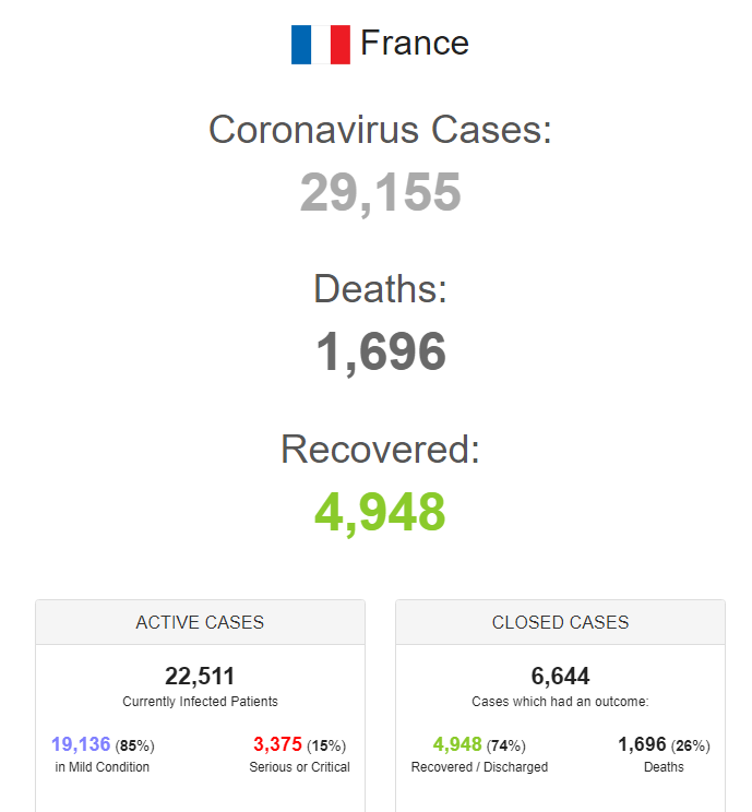 Τα κρούσματα στη Γαλλία έφτασαν συνολικά τις 29.155. Σε διάστημα μίας μέρας έχασαν τη ζωή τους 365 άνθρωποι με τον συνολικό αριθμό θυμάτων να φθάνει τους 1.696. Τα νέα κρούσματα σε μια ημέρα ανήλθαν στις 3.922.