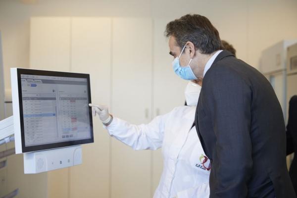 Ο Κυριάκος Μητσοτάκης ενημερώθηκε για την υλικοτεχνική υποδομή του Κέντρου, η οποία επιτρέπει τη μαζική τέλεση μοριακών ελέγχων αίματος και την έκδοση αποτελεσμάτων εντός λίγων ωρών.