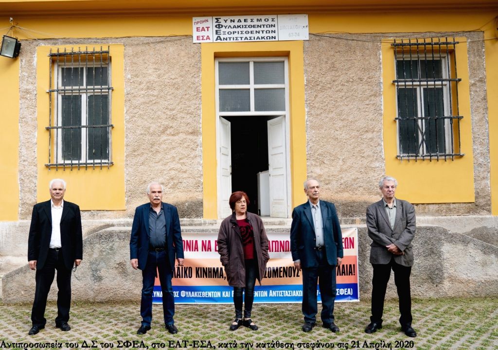 Σήμερα το πρωί της 21ης Απριλίου 2020, 53η επέτειο επιβολής της 7χρονης στρατιωτικής δικτατορίας, αντιπροσωπεία του Δ.Σ. του “ΣΦΕΑ 1957-1974” αποτελούμενη από τους Σπύρο Χαλβατζή, Δώρα Καλλιπολίτη, Νίκο Τριανταφύλλου, Στέργιο Βασιλείου & Κώστα Μανταίο, κατάθεσε στεφάνι, στην προτομή του Σπύρου Μουστακλή, στο πρώην ΕΑΤ-ΕΣΑ, στον τόπο κράτησης και βασανισμού εκατοντάδων αγωνιστών, στην περίοδο της δικτατορίας.