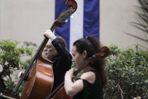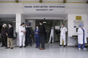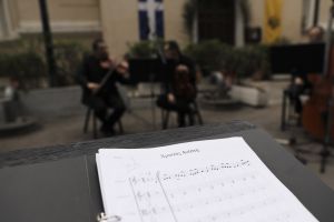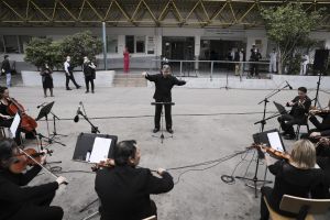 Οκτώ μουσικοί από την ορχήστρα σύγχρονης μουσικής της ΕΡΤ βρέθηκαν στο νοσοκομείο Ευαγγελισμός κι έδωσαν μια μικρή συναυλία με έργα Χατζηδάκι και Θεοδωράκη.
