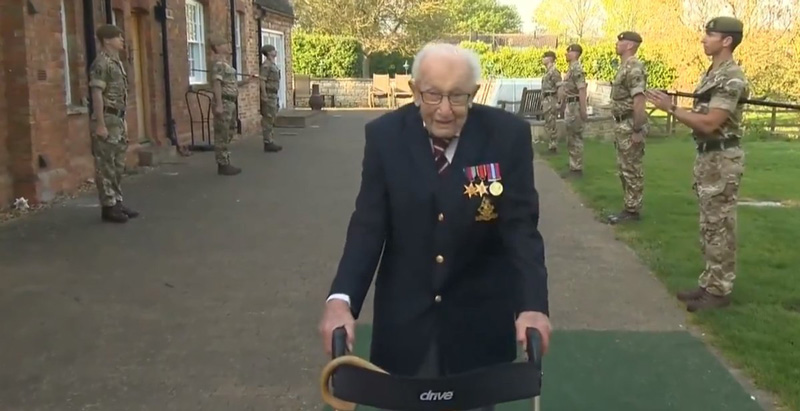 Ο αιωνόβιος Μουρ ολοκλήρωσε τον περιπατητικό άθλο του στις 16 Απριλίου, πλαισιωμένος από τιμητικό άγημα του 1ου Τάγματος του Συντάγματος Πεζικού του Γιόρκσιρ. «Αισθάνομαι καλά, ελπίζω και εσείς να αισθάνεστε καλά» είπε μόλις έκανε το τελευταίο βήμα, με τη βοήθεια του τροχήλατου περιπατητήρα του. «Είμαι ευτυχής που περιβάλλομαι από τους σωστούς ανθρώπους», πρόσθεσε κοιτάζοντας τους στρατιώτες που ήταν παρατεταγμένοι και στις δύο πλευρές του κήπου, τηρώντας, ασφαλώς, την απαραίτητη λόγω κορωνοϊού απόσταση ασφαλείας. Τον ρωτάω ποιες ήταν οι πρώτες σκέψεις του όταν έμαθε πως συγκεντρώθηκε αυτό το αστρονομικό ποσό. «Εμεινα άφωνος. Δεν μπορούσα να το πιστέψω. Το ποσό είναι εκπληκτικό, αλλά πρέπει να σας πω ότι όλοι αυτοί οι γενναίοι και υπέροχοι γιατροί και νοσηλευτές που βρίσκονται στην πρώτη γραμμή, το αξίζουν μέχρι την τελευταία δεκάρα».