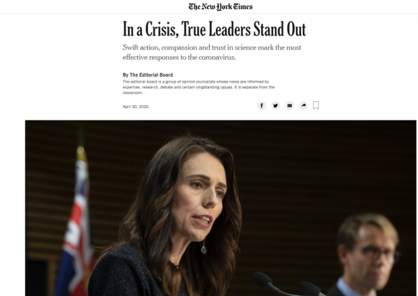 Το άρθρο φέρει τον τίτλο «In a Crisis, True Leaders Stand Out»/ «Οι Πραγματικοί Ηγέτες Ξεχωρίζουν στην Κρίση», και υπότιτλο «Swift action, compassion and trust in science mark the most effective responses to the coronavirus»/ «Άμεση δράση, κατανόηση και εμπιστοσύνη για την επιστήμη, χαρακτηρίζουν τις πιο αποτελεσματικές αντιδράσεις στον κοροναϊό».