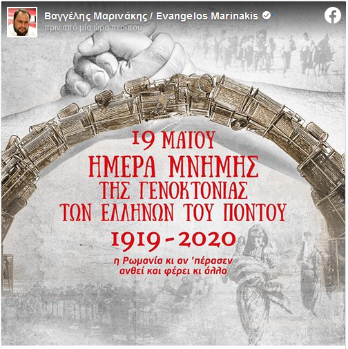 Σήμερα λοιπόν συμπληρώνονται 101 χρόνια από τη Γενοκτονία των Ελλήνων του Πόντου και ο ηγέτης της ΠΑΕ Ολυμπιακός, Βαγγέλης Μαρινάκης, έστειλε το δικό του μήνυμα με ανάρτησή του στο Facebook.