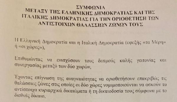 Στο κείμενο της συμφωνίας όσον αφορά τα όρια των θαλασσίων ζωνών σημειώνεται ότι «η οριοθετική γραμμή των θαλασσίων ζωνών στις οποίες οι δύο χώρες νομιμοποιούνται να ασκούν αντιστοίχως τα κυριαρχικά δικαιώματα ή τη δικαιοδοσία τους σύμφωνα με το διεθνές δίκαιο θα είναι η οριοθετική γραμμή για την υφαλοκρηπίδα που καθορίστηκε με τη Συμφωνία του 1977 μεταξύ της Ελληνικής Δημοκρατίας και της Ιταλικής Δημοκρατίας για την οριοθέτηση των αντίστοιχων υφαλοκρηπίδων». Σημείο το οποίο επιβεβαιώνει πέραν των δικαιωμάτων των νησιών και την αρχή της μέσης γραμμής.