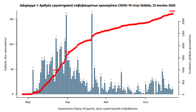 728 (22.0%) θεωρούνται σχετιζόμενα με ταξίδι από το εξωτερικό και 1844 (55.8%) είναι σχετιζόμενα με ήδη γνωστό κρούσμα.