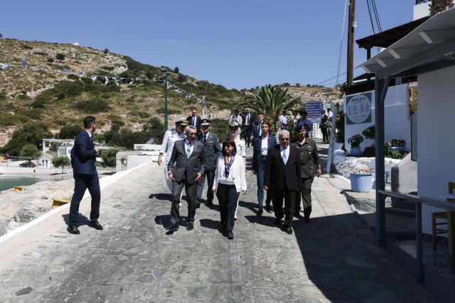 Η κ. Σακελλαροπούλου έφθασε σήμερα το πρωί στο Αγαθονήσι, όπου την υποδέχτηκαν ο περιφερειάρχης Νοτίου Αιγαίου, Γιώργος Χατζημάρκος και ο δήμαρχος, Ευάγγελος Κόττορος. Ξεκίνησε την επίσκεψή της από το φυλάκιο του νησιού, όπου συνομίλησε και ενημερώθηκε από τον επικεφαλής της φρουράς. Ολοκληρώνοντας την επίσκεψή της στο φυλάκιο, έγραψε στο βιβλίο επισκεπτών, υπογραμμίζοντας την τιμή και την υπερηφάνεια της που βρίσκεται στο ακριτικό φυλάκιο του Αγαθονησίου.