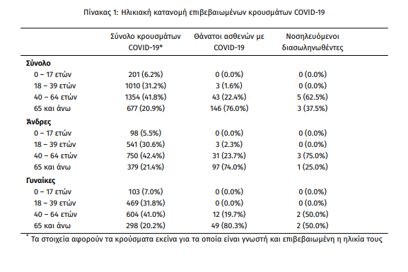 Η μέση ηλικία των κρουσμάτων είναι 47 έτη (εύρος 0 έως 102 ετών), ενώ η μέση ηλικία των θανάτων είναι 76 έτη (εύρος 35 έως 102 ετών). Η ηλικιακή κατανομή των (α) συνολικών κρουσμάτων, (β) των περιστατικών που κατέληξαν σε θάνατο και (γ) των ασθενών που νοσηλεύονται διασωληνωμένοι, είναι η ακόλουθη: