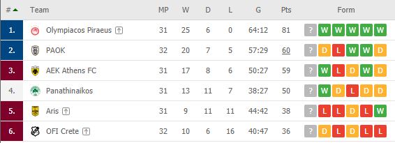 Συγκεκριμένα, η ομάδα του Αμπέλ Φερέιρα προσπέρασε για έναν βαθμό την Ένωση, με 60 έναντι 59, κι αν την Κυριακή η ΑΕΚ περάσει με νίκη από το «Κλεάνθης Βικελίδης» θα βρεθεί δύο βαθμούς πάνω από τον ΠΑΟΚ.
