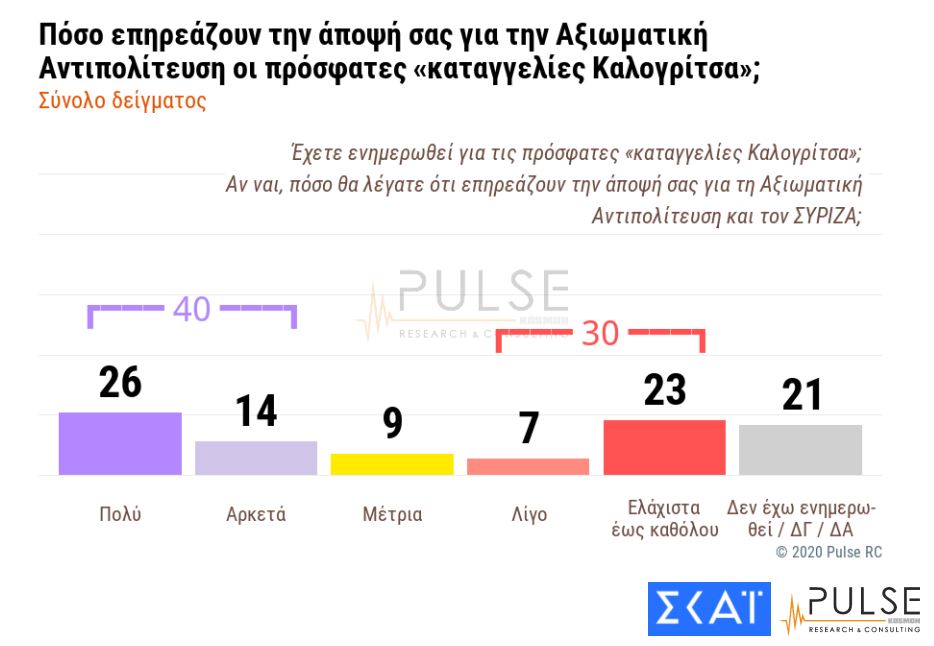 Πιο συγκεκριμένα, το 40% των ερωτηθέντων απαντά ότι οι πρόσφατες καταγγελίες Καλογρίτσα έχουν επηρεάσει πολύ ή αρκετά την άποψή τους για την αξιωματική αντιπολίτευση, έναντι 30% που απαντά ότι επηρεάστηκε ελάχιστα ή καθόλου. Το 21% των ερωτηθέντων απάντησε πως δεν έχει ενημερωθεί για την υπόθεση.