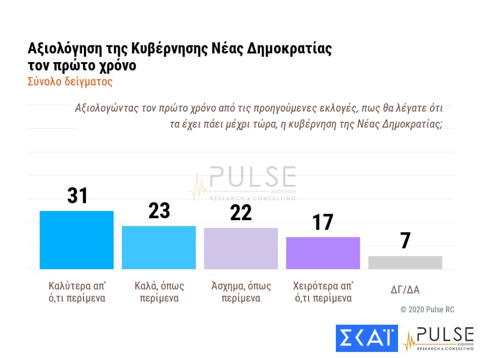 Θετικά αποτιμά η πλειοψηφία των πολιτών τη διακυβέρνηση της ΝΔ και του Κυριάκου Μητσοτάκη ένα χρόνο μετά την ανάληψη των καθηκόντων, σύμφωνα με την πανελλαδική έρευνα της εταιρίας Pulse RC για λογαριασμό του ΣΚΑΪ. Η έρευνα έγινε τηλεφωνικά με χρήση δομημένου ηλεκτρονικού ερωτηματολογίου σε δείγμα 1.305 ατόμων, το διάστημα 6 έως 8 Ιουλίου 2020.