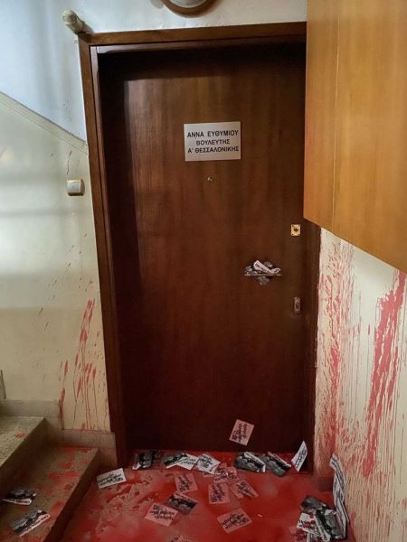 Τρικάκια και μπογιές έξω από το πολιτικό γραφείο της βουλευτού της ΝΔ, Άννας Ευθυμίου, στη Θεσσαλονίκη πέταξαν άγνωστοι κατά τη διάρκεια του Σαββατοκύριακου.