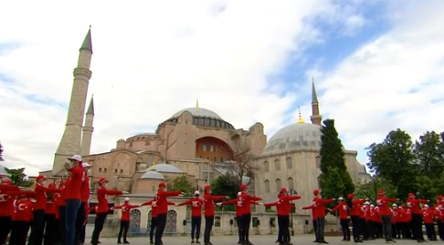 Ενδεικτικά το πόσο προκλητικά σκηνοθετημένο ήταν όλο αυτό, είναι η στιγμή (στο 4ο λεπτό του βίντεο) όπου οι χορευτές έχουν σχηματίσει τη σημαία της Τουρκίας και αυτή εναλλάσσεται με την εικόνα της Αγίας Σοφίας.