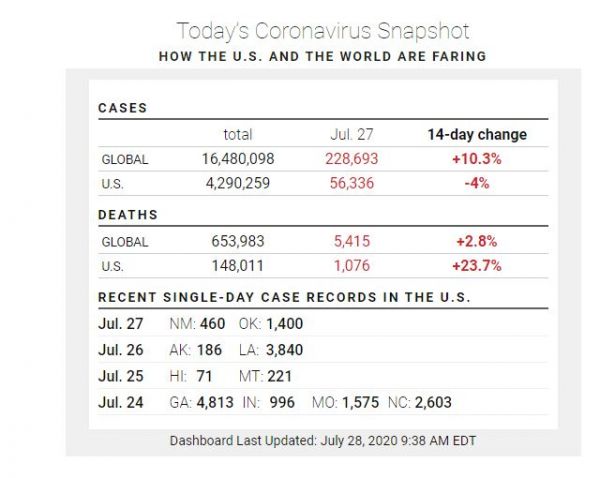 Από τις 27 Ιουλίου, οι ΗΠΑ μετρούν περισσότερα από 4,2 εκατομμύρια συνολικά αναφερόμενα περιστατικά και σχεδόν 150.000 θανάτους που σχετίζονται με το COVID-19.