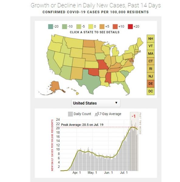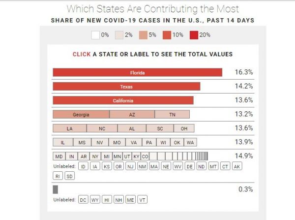Αν και οι ημερήσιοι αριθμοί κρουσμάτων αυξάνονται σε όλες τις ΗΠΑ, ο αντίκτυπος δεν κατανέμεται εξίσου σε όλες τις πολιτείες. Οι πολιτείες που σταμάτησαν πρώτες το lockdown – κυρίως επειδή δεν χτυπήθηκαν σκληρά από την πανδημία- τώρα αποτελούν την πλειοψηφία των κρουσμάτων εκεί.