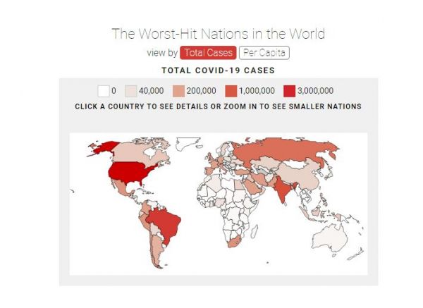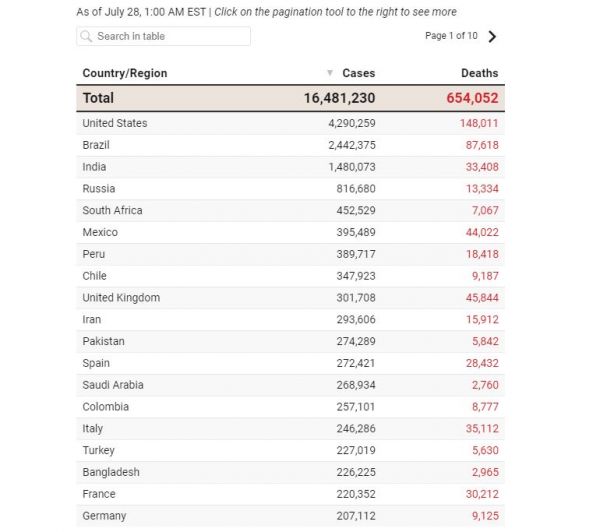 Την ίδια ώρα περίπου 190 χώρες και επικράτειες έχουν αναφέρει τουλάχιστον μία περίπτωση του νέου κοροναϊού. Συνολικά, υπάρχουν περισσότερα από 16,4 εκατομμύρια επιβεβαιωμένα κρούσματα και περισσότεροι από 650.000 σχετικοί θάνατοι παγκοσμίως.