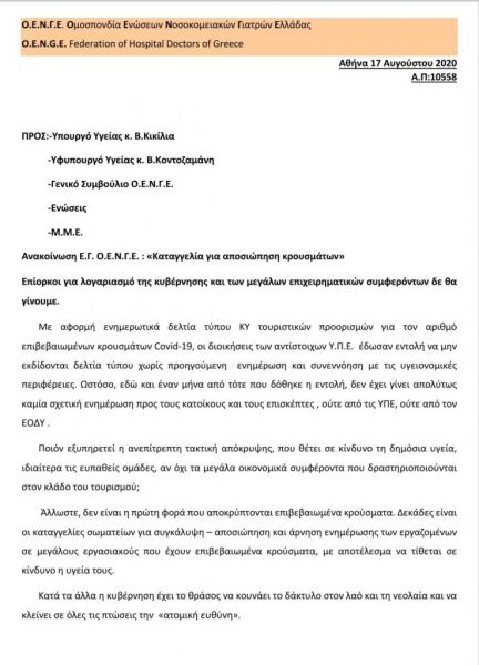 «Η χτεσινή καταγγελία της Ομοσπονδίας Ενώσεων Νοσοκομειακών Γιατρών Ελλάδας (ΟΕΝΓΕ), αποκαλύπτει μεθοδευμένη αποσιώπηση κρουσμάτων Covid-19 σε τουριστικούς προορισμούς, με ευθύνη της κυβέρνησης.
