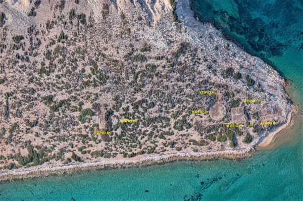 Το Κτήριο Ατ είναι το δυτικότερο από όσα έχουν εντοπιστεί. Είναι επίμηκες, χτισμένο σε πλαγιά με ισχυρή κατωφέρεια και προσανατολισμό Β Ν. Αποτελείται από τρείς χώρους. Σε μικρή απόσταση από αυτό εντοπίστηκαν αλλά δεν ανεσκάφησαν δύο ακόμη κτήρια, το Ητ, που αποτελείται από τουλάχιστον δύο χώρους και το Θτ. Το Κτήριο Βτ είναι το μεγαλύτερο που έχει εντοπιστεί έως τώρα και το πρώτο που συναντά κανείς όταν προσεγγίζει το νησί από το νότο. Αποτελείται από τουλάχιστον πέντε χώρους, σε έναν από τους οποίους εντοπίστηκε μεγάλος αριθμός κεραμικής χρηστικής και θραυσμάτων ανάγλυφων πίθων. Τα ευρήματα από το κτίριο, ανάμεσα στα οποία πολλά θραύσματα αρχαϊκών πίθων με εγχάρακτη και εμπίεστη διακόσμηση δίνουν ένα χρονολογικό ορίζοντα χρήσης του από τον 7ο έως τον πρώιμο 5ο αιώνα.