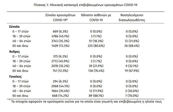 Η διάμεση ηλικία των θανόντων συμπολιτών μας ήταν τα 78 έτη και το 96.1% είχε κάποιο υποκείμενο νόσημα ή/και ηλικία 70 ετών και άνω.