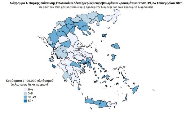 - 86 κρούσματα στην Π.Ε. Αττικής, εκ των οποίων 16 αναφέρουν πρόσφατο ταξίδι στο εσωτερικό της χώρας, ενώ 4 συνδέονται με συρροές
