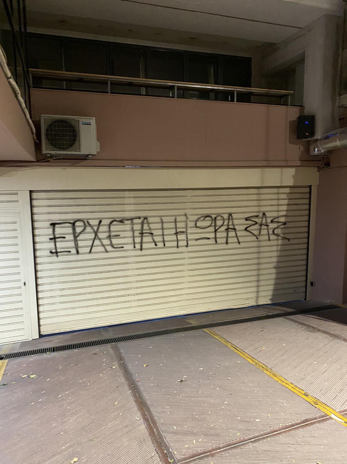 Οι άγνωστοι έσπασαν τζάμια, έγραψαν το απειλητικό μήνυμα «έρχεται η ώρα σας» και ζωγράφισαν το σήμα της αναρχίας.
