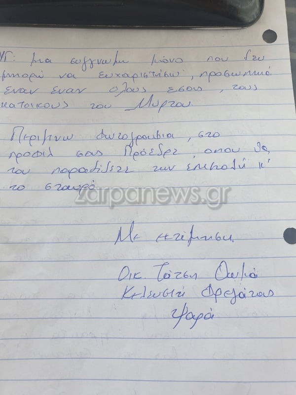 Μια συγκινητική επιστολή έφτασε στα χέρια των ανθρώπων στο χωριό Μύρτος στα νοτιοανατολικά της Κρήτης, το οποίο έγινε γνωστό και αγαπητό σε όλη την Ελλάδα μετά την αξιοθαύμαστη πρωτοβουλία να μεταφερθούν τρόφιμα στη φρεγάτα «Λήμνος» και τα λοιπά υποστηρικτικά πλοία που έπλεαν εκείνες τις μέρες στα ανοικτά κοντά στο χωριό.