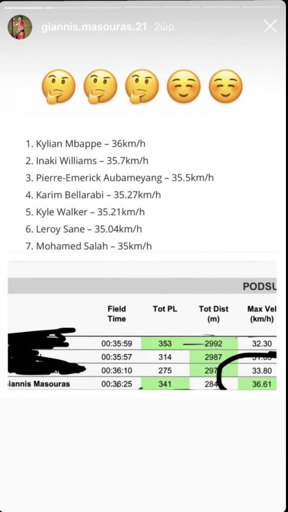 Συγκεκριμένα, στην παρακάτω φωτογραφία, είναι το ρεκόρ του Γάλλου αστέρα της Παρί Σεν Ζερμέν, το οποίο είναι 36 χιλιόμετρα την ώρα και ο άσος του Ολυμπιακού έκανε 36,6.