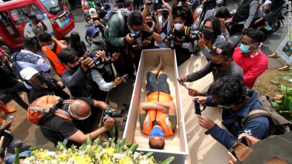 Οι αρχές στην πρωτεύουσα, Τζακάρτα, υιοθέτησαν μια παρόμοια λύση στην αρχή του μήνα. Ένας άνδρας που συνελήφθη να μην φορά μάσκα, υποχρεώθηκε να ξαπλώσει μέσα σε ένα φέρετρο σε κοινή θέα.