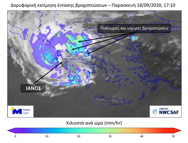 Οι δορυφορικές εκτιμήσεις που λαμβάνει και επεξεργάζεται το Εθνικό Αστεροσκοπείο Αθηνών/meteo.gr, δείχνουν ότι σε πολλές περιοχές της ηπειρωτικής Ελλάδας σημειώνονται ραγδαιότητες βροχόπτωσης άνω των 50 χιλιοστών ανά ώρα.