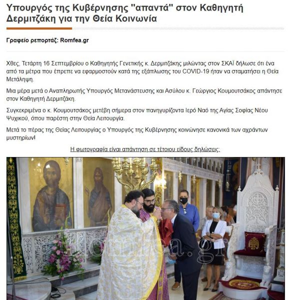 Συγκεκριμένα, σύμφωνα με δημοσίευση του romfea.gr ο υπουργός φαίνεται πως μια μέρα μετά τις δηλώσεις του κ. Δερμιτζάκη, ο Κουμουτσάκος μετέβη στον Ιερό Ναό της Αγίας Σοφίας Νέου Ψυχικού, όπου παρέστη στην Θεία Λειτουργία.