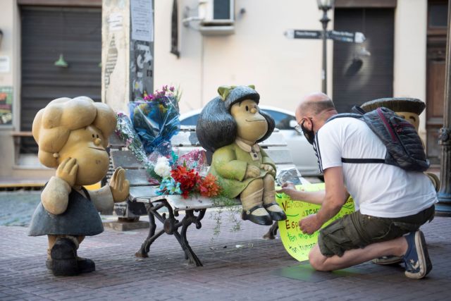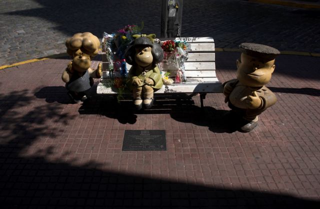 Το άγαλμα της Μαφάλντα, του κοριτσιού που μισεί τη σούπα και λατρεύει τους Beatles, κατακλύστηκε από λουλούδια, από αναγνώστες που πήγαν να τιμήσουν τον δημιουργό της στην ιστορική συνοικία Σαν Τέλμο, στο κέντρο του Μπουένος Άιρες.