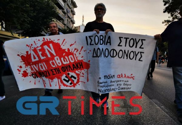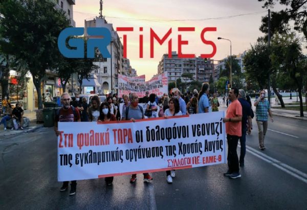 Κρατώντας πανό και φωνάζοντας συνθήματα, μέλη κομμάτων της εξωκοινοβουλευτικής αριστεράς και φοιτητικών συλλόγων, της ΕΛΜΕ-Θ κ.α, απαιτούν την «καταδίκη των ναζί».
