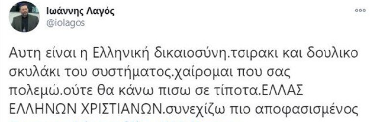 «Αυτή είναι η ελληνική Δικαιοσύνη. τσιράκι και δουλικό σκυλάκι του συστήματος. Χαίρομαι που σας πολεμώ. Ούτε θα κάνω πίσω σε τίποτα. ΕΛΛΑΣ ΕΛΛΗΝΩΝ ΧΡΙΣΤΙΑΝΩΝ. Συνεχίζω πιο αποφασισμένος», έγραψε χαρακτηριστικά.