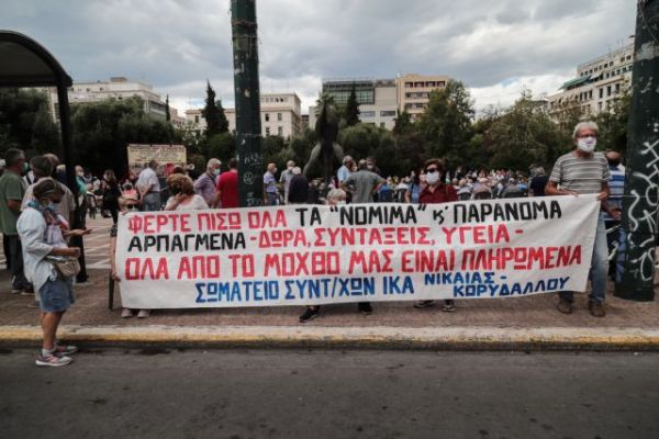 «Φέρτε πίσω όλα τα «νόμιμα» και παράνομα αρπαγμένα», αναγράφεται σε πανό που είχε αναρτηθεί στη συγκέντρωση των συνεργαζόμενων οργανώσεων συνταξιούχων.