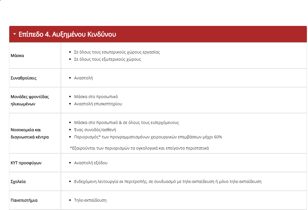 Στην ιστοσελίδα του χάρτη υγειονομικής ασφάλειας, ωστόσο, αναφέρεται απλά για το επίπεδο 4: «Σχολεία – Ενδεχόμενη λειτουργία εκ περιτροπής, σε συνδυασμό με τηλε-εκπαίδευση ή μόνο τηλε-εκπαίδευση».