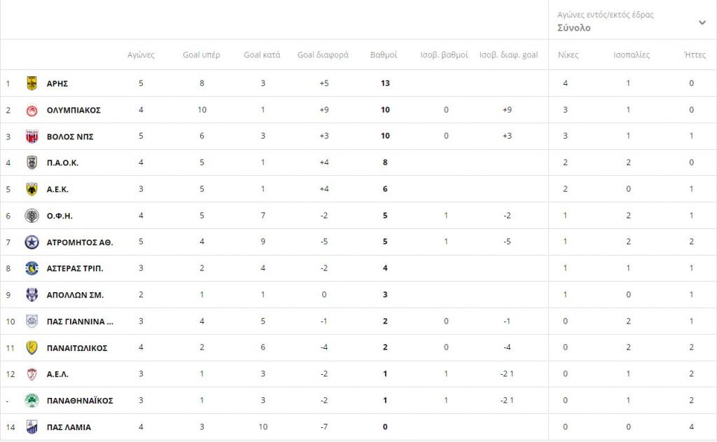 Έτσι ο Άρης παρέμεινε στην κορυφή με 13 βαθμούς και ακολουθεί ο Ολυμπιακός με 10 αλλά και ματς λιγότερο, ενώ 10 βαθμούς έχει και ο Βόλος.
