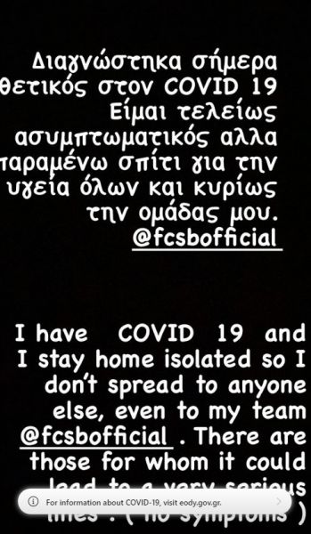 Όπως έγραψε και ο ίδιος, είναι τελείως ασυμπτωματικός και μόλις διαγνώστηκε θετικός, τέθηκε αμέσως σε καραντίνα στο σπίτι του για να προστατεύσει τους γύρω του αλλά και την ομάδα του FCSB.