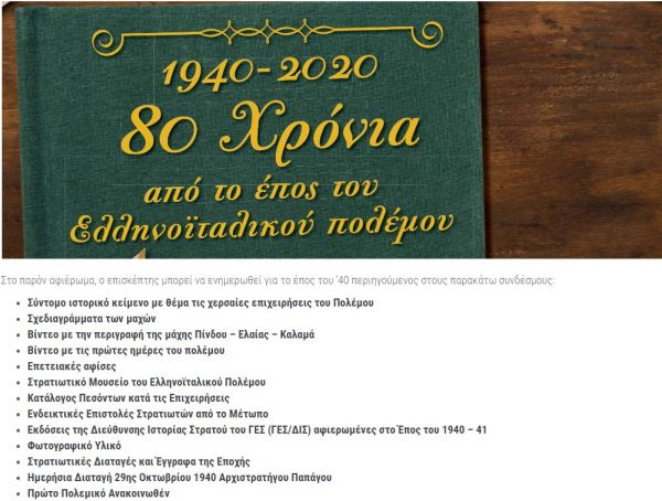 Οι Επιτελείς του ΓΕΣ έχουν φτιάξει ένα άρτιο και λεπτομερές αφιέρωμα για την Επέτειο του «ΟΧΙ». Ο επισκέπτης μπορεί πατώντας στον σύνδεσμο http://army.gr/el/afieroma-sto-epos-40 να δει ημερήσιες διαταγές, έγγραφα της εποχής, ιστορικές αφίσες αλλά και το πρώτο πολεμικό ανακοινωθέν.
