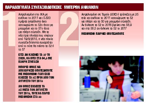 1. Στον δημόσιο τομέα. Οι μητέρες ανηλίκων που είχαν 25ετία και ανήλικο τέκνο το 2010 και είχαν συμπληρώσει το 50ό έτος της ηλικίας τους μέχρι τις 18/8/2015 μπορούν να φύγουν με πλήρη σύνταξη. Αν το ηλικιακό όριο των 50 ετών συμπληρωνόταν μετά τις 18 Αυγούστου αλλά μέσα στο 2015, το νέο ηλικιακό όριο είναι το 55ο έτος, δηλαδή μπορούν να φύγουν με πλήρη σύνταξη στα 55. Αν το συμπλήρωσαν το 2016, πάνε 56 ετών και 9 μηνών. Αν το συμπλήρωσαν το 2017, πάνε 58 ετών και 5 μηνών.
