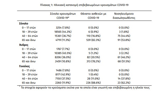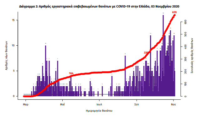 Συγκεκριμένα, έχουμε 13 ακόμα καταγεγραμμένους θανάτους και 655 θανάτους συνολικά στη χώρα. 255 (38.9%) γυναίκες και οι υπόλοιποι άνδρες. Η διάμεση ηλικία των θανόντων συμπολιτών μας ήταν τα 79 έτη και το 96.3% είχε κάποιο υποκείμενο νόσημα ή/και ηλικία 70 ετών και άνω.