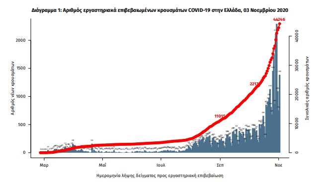 Πρόκειται για τη δεύτερη φορά που σπάει το «φράγμα» των 2.000 ημερήσιων περιστατικών, με τα κρούσματα να παραμένουν σταθερά πάνω από 1.000 εδώ και μία εβδομάδα (από την Τρίτη 27 Οκτωβρίου).