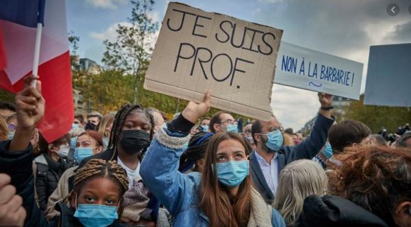 Αφού υπενθυμίζει τη σειρά των τρομοκρατικών επιθέσεων που σημειώθηκαν στη Γαλλία μετά από την επίθεση στη σατιρική εφημερίδα Charlie Hebdo το 2015, από τις οποίες σκοτώθηκαν 300 άνθρωποι, ο Μακρόν εξηγεί ότι η Γαλλία δέχεται επίθεση για τις αξίες της, την κοσμικότητα του κράτους της, την ελευθερία της έκφρασης και υπογραμμίζει ότι «δεν θα εκχωρήσει τίποτα».
