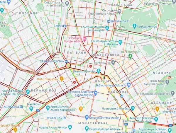 Το κέντρο, ειδικότερα, είναι στο «κόκκινο», με κυκλοφοριακή συμφόρηση να σημειώνεται στην Εθνική Οδό, στη Βασιλίσσης Σοφίας, στην Πειραιώς, στην Λεωφόρο Αθηνών, Πανεπιστημίου καθώς και Ποσειδώνος.