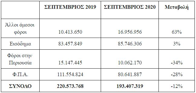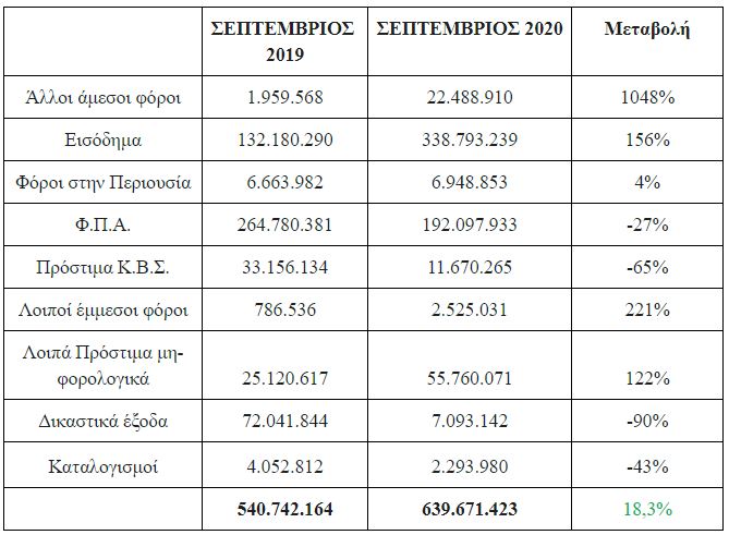 Σε ό,τι αφορά τις εισπράξεις έναντι νέου ληξιπροθέσμου για τον Σεπτέμβριο (εξαιρουμένων των μη φορολογικών κατηγοριών), έφτασαν τα 206 εκατ. (έναντι 233 εκατ. την αντίστοιχη περίοδο του 2019), εκ των οποίων το μεγαλύτερο ποσοστό (92%) οφείλεται στις παρακάτω κατηγορίες φόρων: