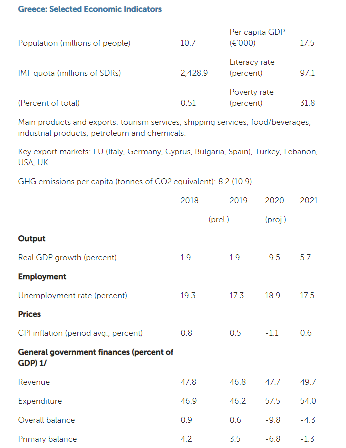 Στην έκθεσή του το Ταμείο συμπεραίνει πως η πανδημία διέκοψε την πορεία ήπιας ανάκαμψης της ελληνικής οικονομίας και πως τα έκτακτα κυβερνητικά μέτρα είχαν ως αποτέλεσμα τη συρρίκνωση του ΑΕΠ κατά 7,9% του ΑΕΠ το α’ εξάμηνο του 2020. Τονίζει πως η οικονομία αναμένεται να καταγράψει μεγάλη ύφεση πριν ξεκινήσει η σταδιακή ανάκαμψη σε μεσοπρόθεσμο επίπεδο λόγω της ανάκαμψης της ιδιωτικής κατανάλωσης, τις επενδύσεις που συνδέονται με τις ιδιωτικοποιήσεις, την αύξηση των εξαγωγών και τις πρώτες εκταμιεύσεις από το Ταμείο Ανάκαμψης,