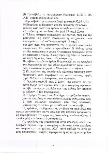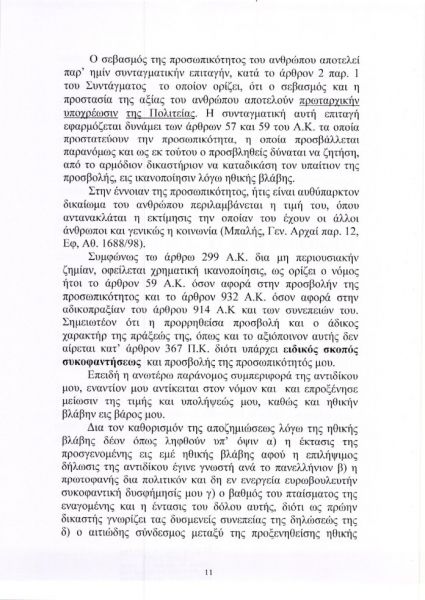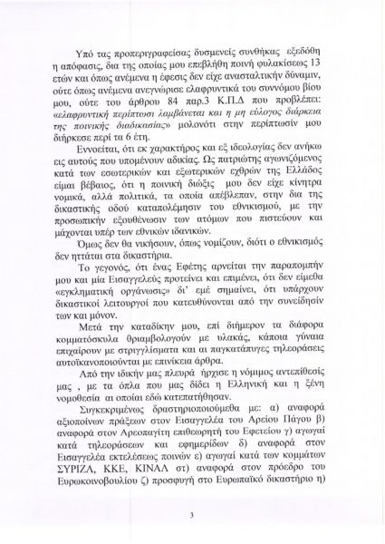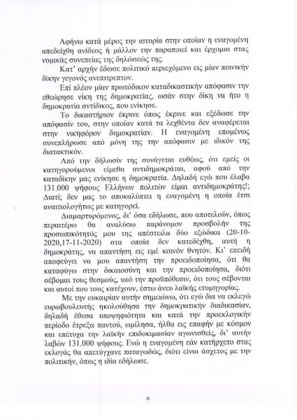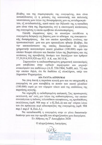 Με την αγωγή, την οποία κατέθεσε ο δικηγόρος του Κώστας Πλεύρης, ο καταδικασθείς ζητά το ποσό των 100.000 ευρώ νομιμότοκα επειδή, όπως ισχυρίζεται, η Πρόεδρος της Δημοκρατίας, προσέβαλε, μεταξύ άλλων, το τεκμήριο της αθωότητάς του, την προσωπικότητά του, το δικαίωμα αυτοπροσδιορισμού του και «με την απαράδεκτη στάση της και τις ακόμα πιο απαράδεκτες δηλώσεις της επηρέασε το Εφετείο» στο οποίο θα εκδικαστεί η έφεσή του.