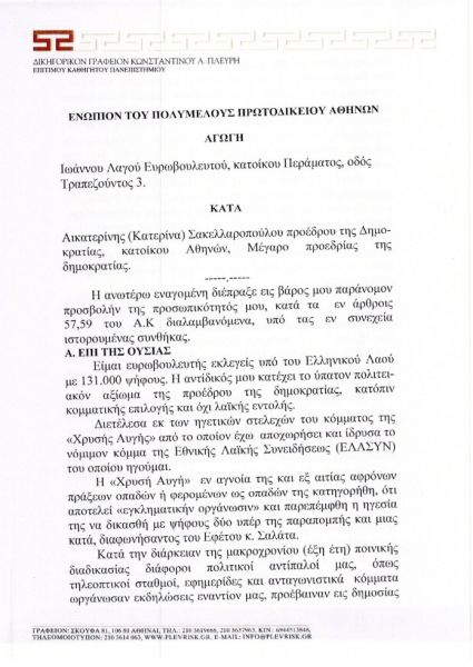 Αποζημίωση ύψους 100.000 ευρώ διεκδικεί μέσω αγωγής από την Πρόεδρο της Δημοκρατίας, Κατερίνα Σακελλαροπούλου, ο ευρωβουλευτής Γιάννης Λαγός, ο οποίος καταδικάστηκε στην υπόθεση της Χρυσής Αυγής σε ποινή κάθειρξης 13 ετών για διεύθυνση εγκληματικής οργάνωσης και οπλοκατοχή.