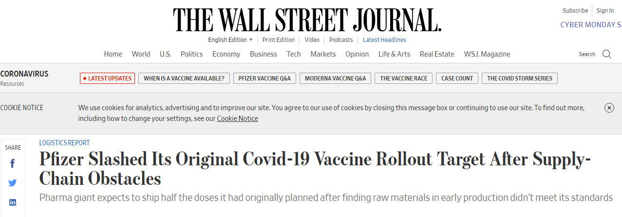 «Η αύξηση στον εφοδιασμό πρώτων υλών διήρκεσε περισσότερο από το αναμενόμενο» δήλωσε εκπρόσωπος της Pfizer στην WSJ. «Είναι σημαντικό να υπογραμμίσουμε ότι το αποτέλεσμα της κλινικής δοκιμής καθυστέρησε κάπως σε σχέση με τον αρχικό προγραμματισμό», προσέθεσε ο εκπρόσωπος.