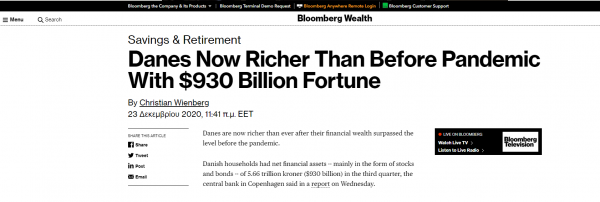Σύμφωνα με το Bloomberg, τα νοικοκυριά στη Δανία είχαν καθαρά χρηματοοικονομικά περιουσιακά στοιχεία – κυρίως με τη μορφή μετοχών και ομολόγων – 5,66 τρισεκατομμύρια κορώνες (930 δισεκατομμύρια δολάρια) το τρίτο τρίμηνο, σύμφωνα με στοιχεία που δημοσίευσε την Τετάρτη η Κεντρική Τράπεζα της χώρας.