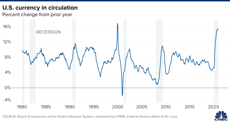 Αυτό, σύμφωνα με το CNBC, είναι λόγω της μαζικής διοχέτευσης μετρητών λόγω της στήριξης των αρχών και έτσι τα χρήματα που κυκλοφορούν ανέρχονται σε 2,07 τρισεκατομμύρια δολάρια.
